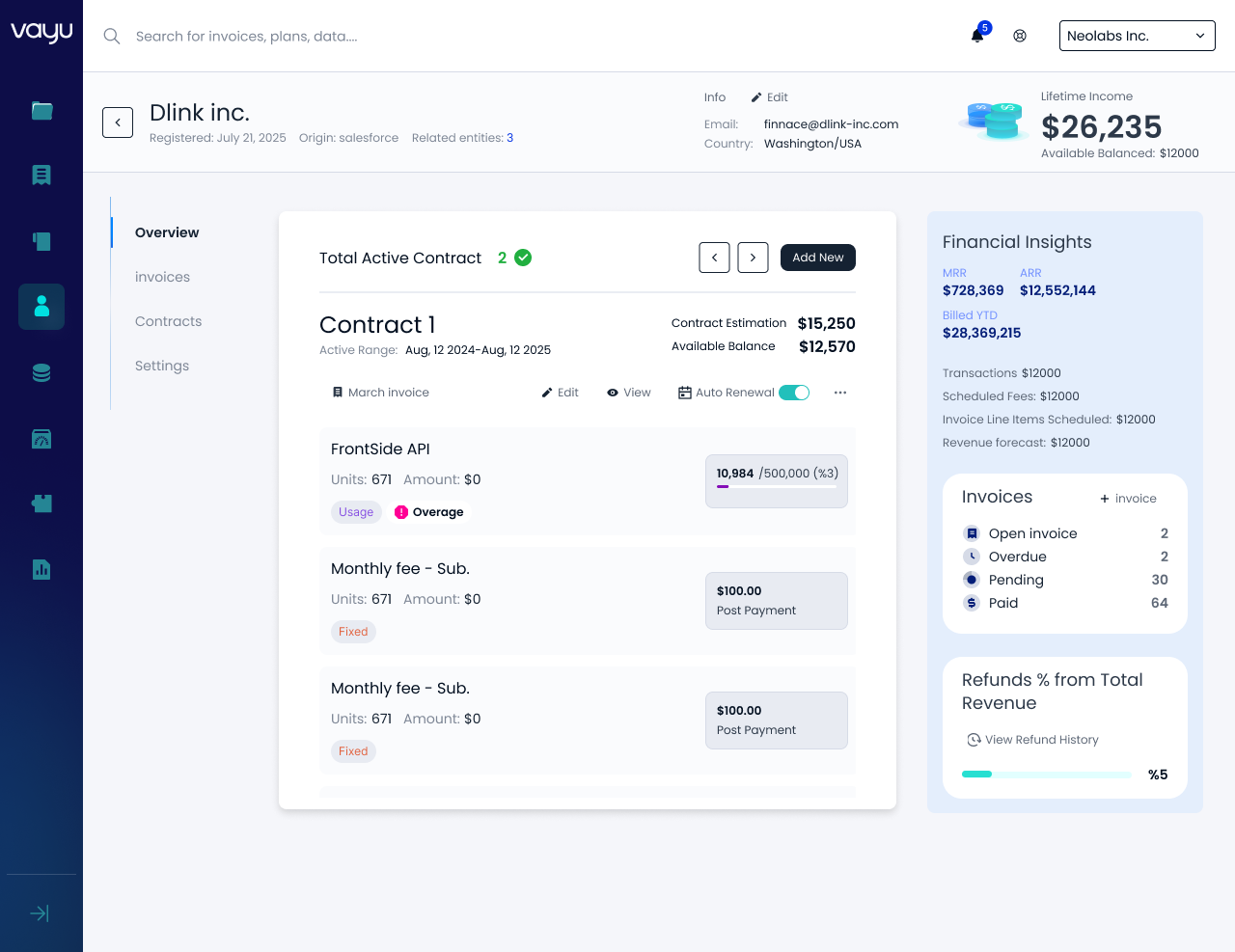 This creates a navigable hub for managing contracts.New design now includes easy to access metrics, and places actionable contract lifecycle actions in the front:- Billing Tab
